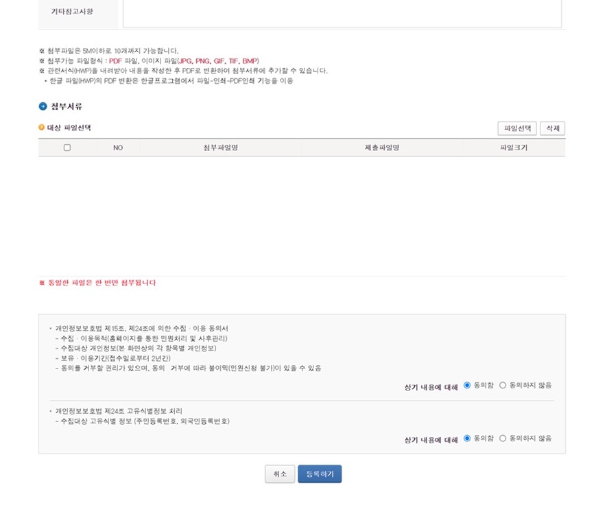 6) 모든 정보를 정확하게 입력하고 서류를 첨부한 후, 신청을 완료합니다.