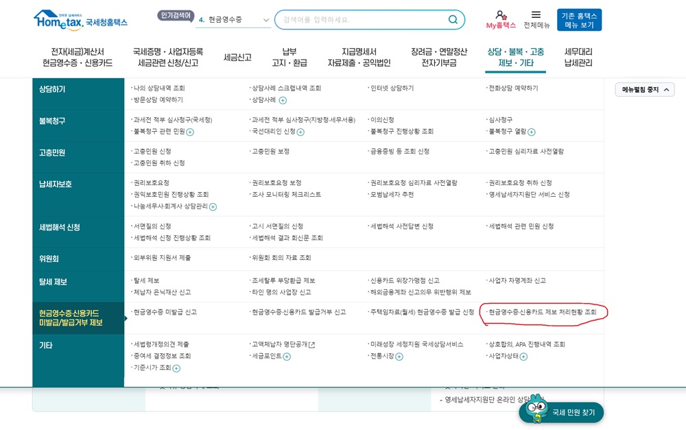 7) 신청 후에는 '상담.불복.고충.제보.기타' 메뉴에서 '현금영수증.신용카드 제보 처리현황 조회'를 통해 신청 처리 상태를 확인할 수 있습니다.